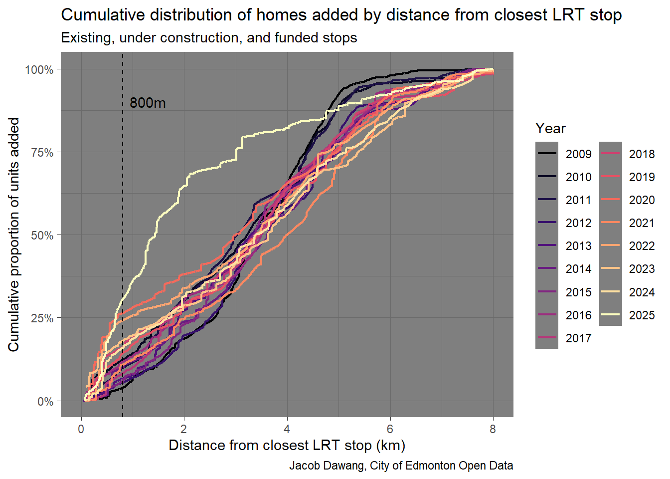 Besides the direct effect on housing supply and affordability, Edmonton’s zoning changes have enabled more people than ever to live close to transit. That means fewer people driving, less congestion, and less greenhouse gas emissions. In 2025, more homes were permitted close to transit than ever before. Figure 5, shows just how differentiated 2025 is. Besides permitting 30% of homes within 800m of transit, a record high for this threshold, the entire cumulative distribution is bowed up and to the left. That means we’re building substantially closer to transit than ever before. Even if people don’t live within walking distance, more people are going to have options that are a short bus ride or bike ride away.