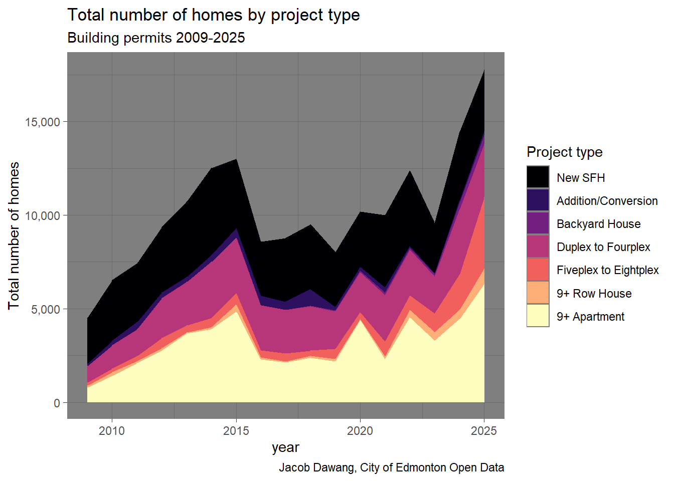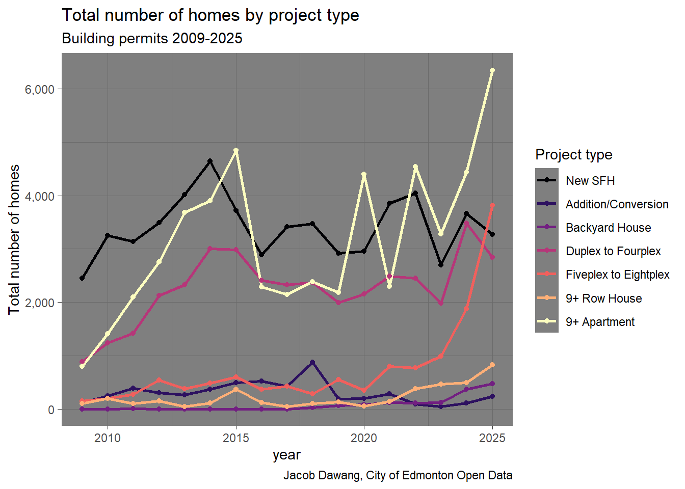 In Figure 4, we can see that 5-8 unit rowhomes and 9+ apartments drove the increase in homes in 2025. While 9+ apartments have historically reached the same scale as in 2025, the rise of 5-8 unit rowhomes is astounding. There is no other explanation except that Edmonton legalized 5-8 unit rowhomes in mature neighbourhoods at the exact right time, when demand was highest.