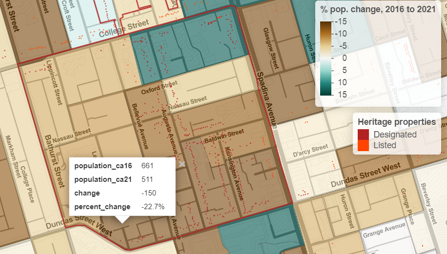 On the other hand, except for that one DA at the corner of College and Spadina, Kensington has lost population from 2016 to 2021. Keeping built form preserved with heritage might not stop gentrification. Restrictions on building housing across the city with a growing population mean that some neighbourhoods may just change from the inside instead of the outside. Heritage only protects aesthetics.