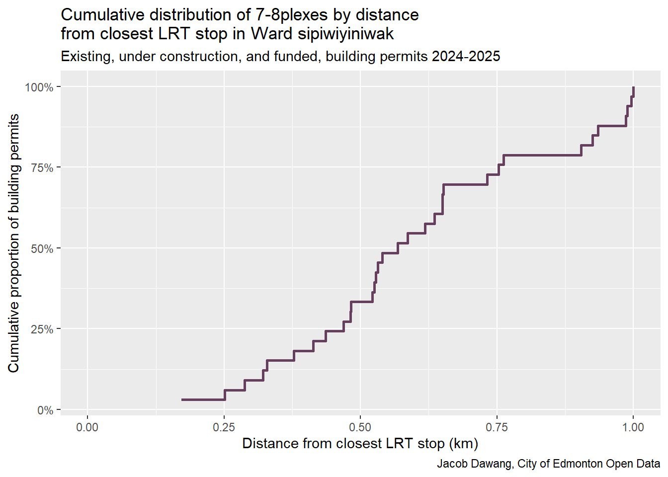 To quantify distance from LRT, let’s look at the cumulative distribution of 7-8plexes by distance from LRT. Figure 4 confirms that 7-8plexes are essentially following the Valley Line West. 75% are built within 1km of a LRT stop, 50% are less than 750m away.