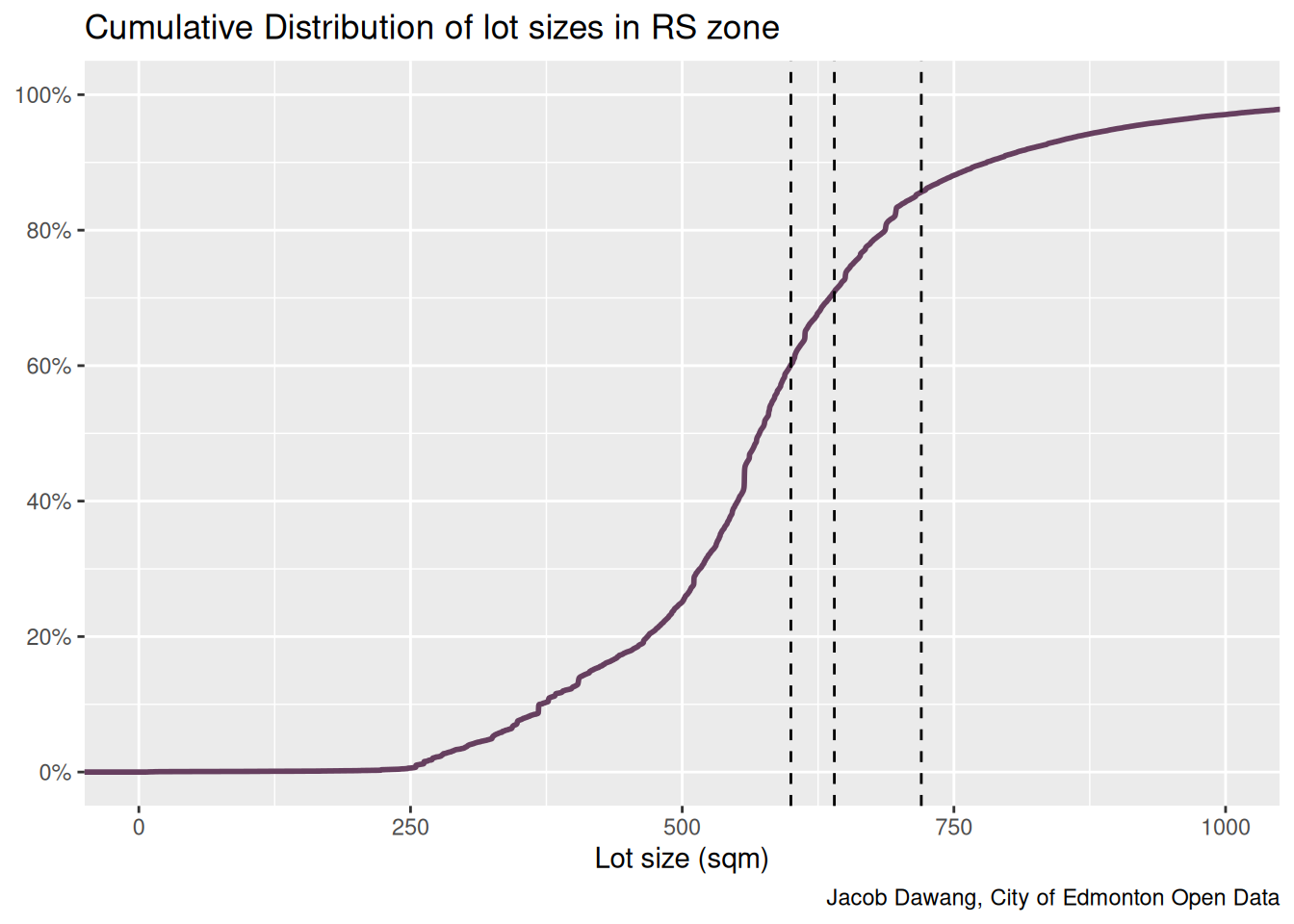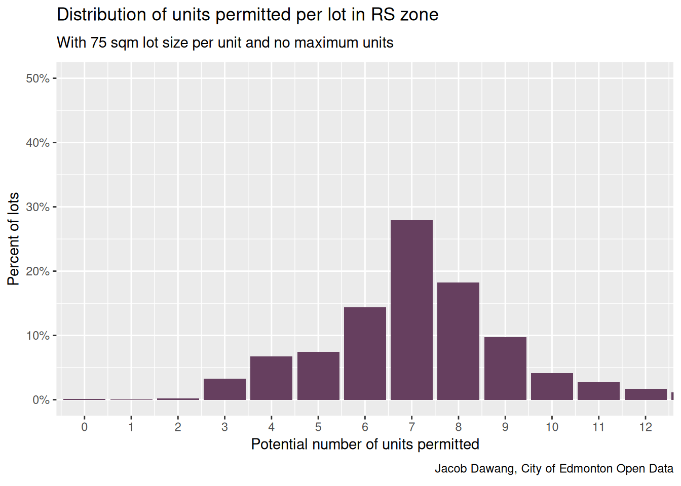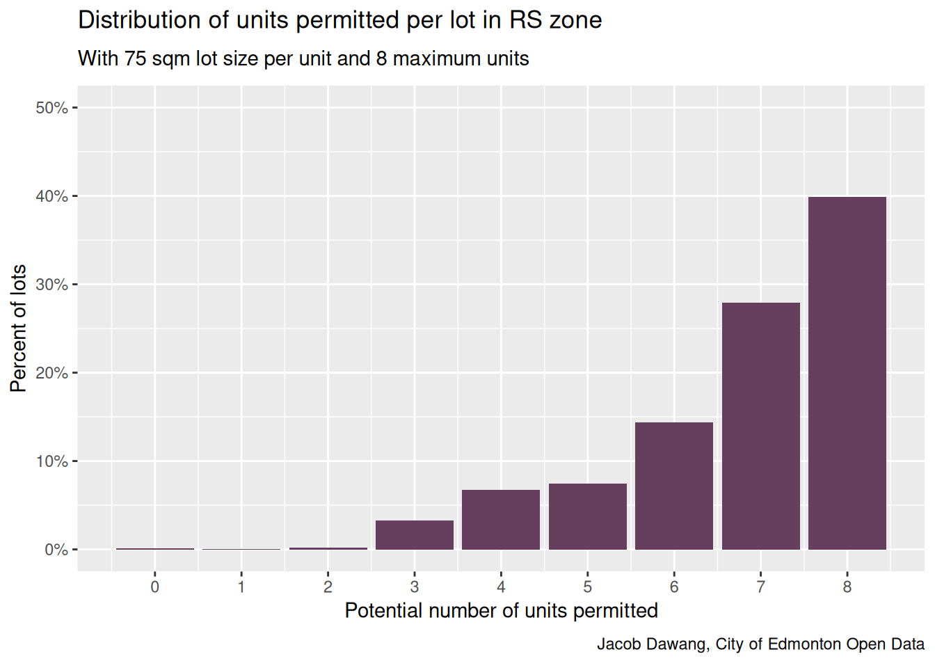 First, let’s examine the lot size of all RS-zoned properties in Edmonton. Figure 1 shows that lot sizes in Edmonton are generally large. I’ve added dashed lines at where 75m2, 80m2, and 90m2 lot area per unit would allow eight units. This tells us that moving from 75m2 to 80m2 would be detrimental. Moving to 90m2 would sanitize large swaths of the RS zone to having eight homes or more, regardless of the hard cap.