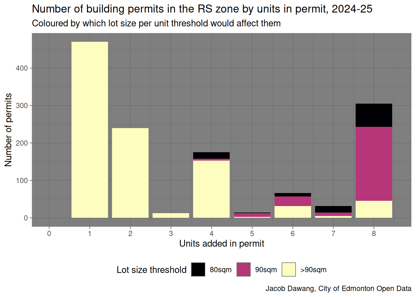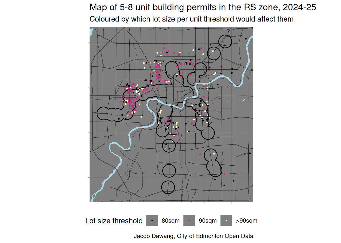 Not all lots are likely to be developed. We can take a look at building permits from the past couple years to get an idea of how these lot area thresholds would have retroactively affected them. Figure 5 is a map of all 5-8 home building permits in the RS zone in 2025, coloured by the lot area per unit threshold under which they would no longer be allowed. At the first threshold of 80m2, a cluster of permits around the university and Valley Line Southeast are no longer permit. The second threshold of 90m2 notably would no longer permit the cluster of permits along the Valley Line West, as well as the vast majority of the remaining 5-8 unit building permits.