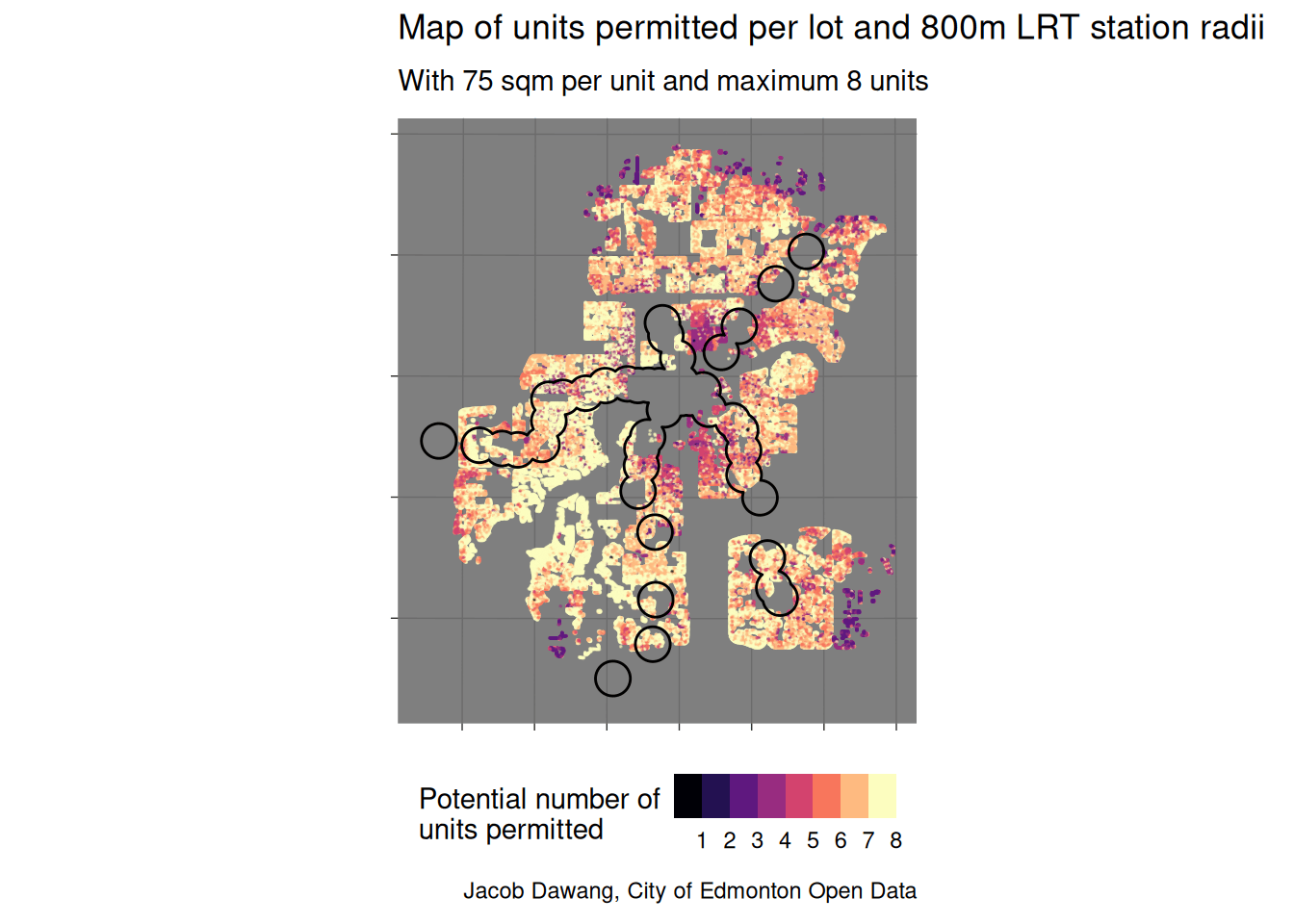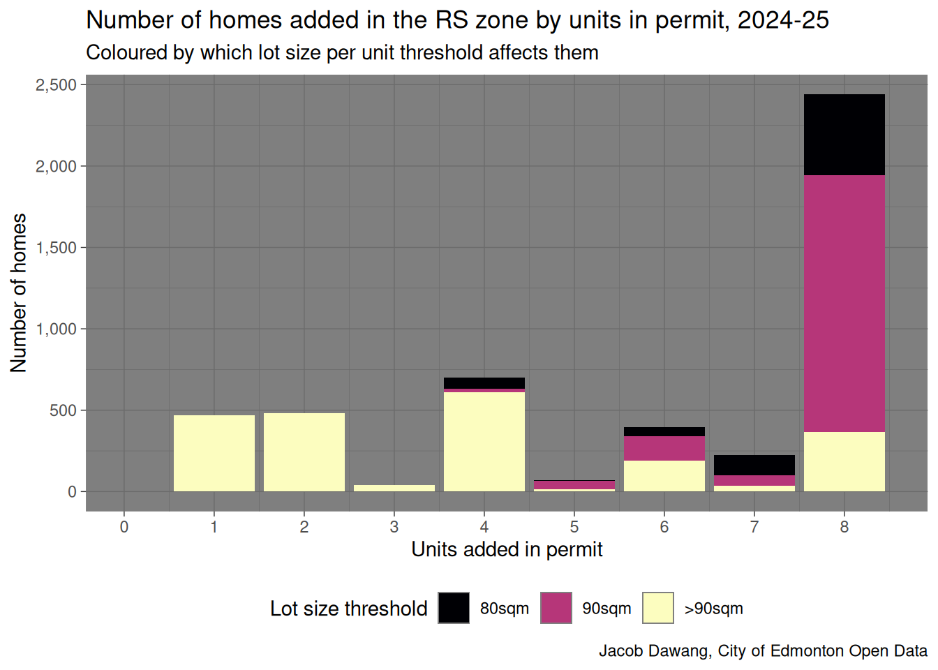 Let’s map the thresholds. Figure 4 shows every lot in the RS zone and the number of homes it would allow under the proposed lot area thresholds, assuming an eight-home hardcap. The clear issue here is that the larger lots are generally located away from transit, in areas that are not conducive to building infill rowhomes, and areas that have not seen much new construction at all. The biggest effect is around the Valley Line West, where at 90m2, wide swathes of land see reduced permissions.