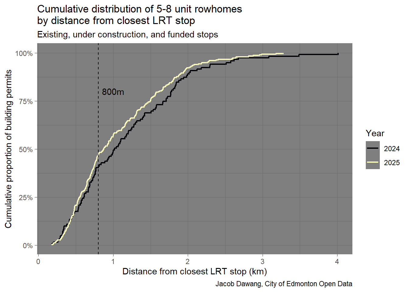 Figure 7 confirms around 50% of 5-8 unit rowhomes permitted in 2025 were within 800m of an LRT stop. 2025 is even an improvement over 2024, with the distribution bowed out and to the left.