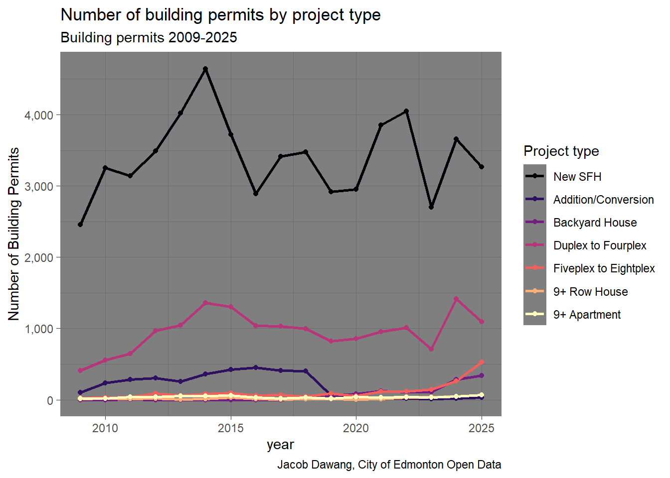 Edmonton’s general building permit data has tracked building permits since 2009. It contains columns for building type, work type, location, units added, and more for each building permit. This data and processing is the same as in previous posts, so you can read those for more information.