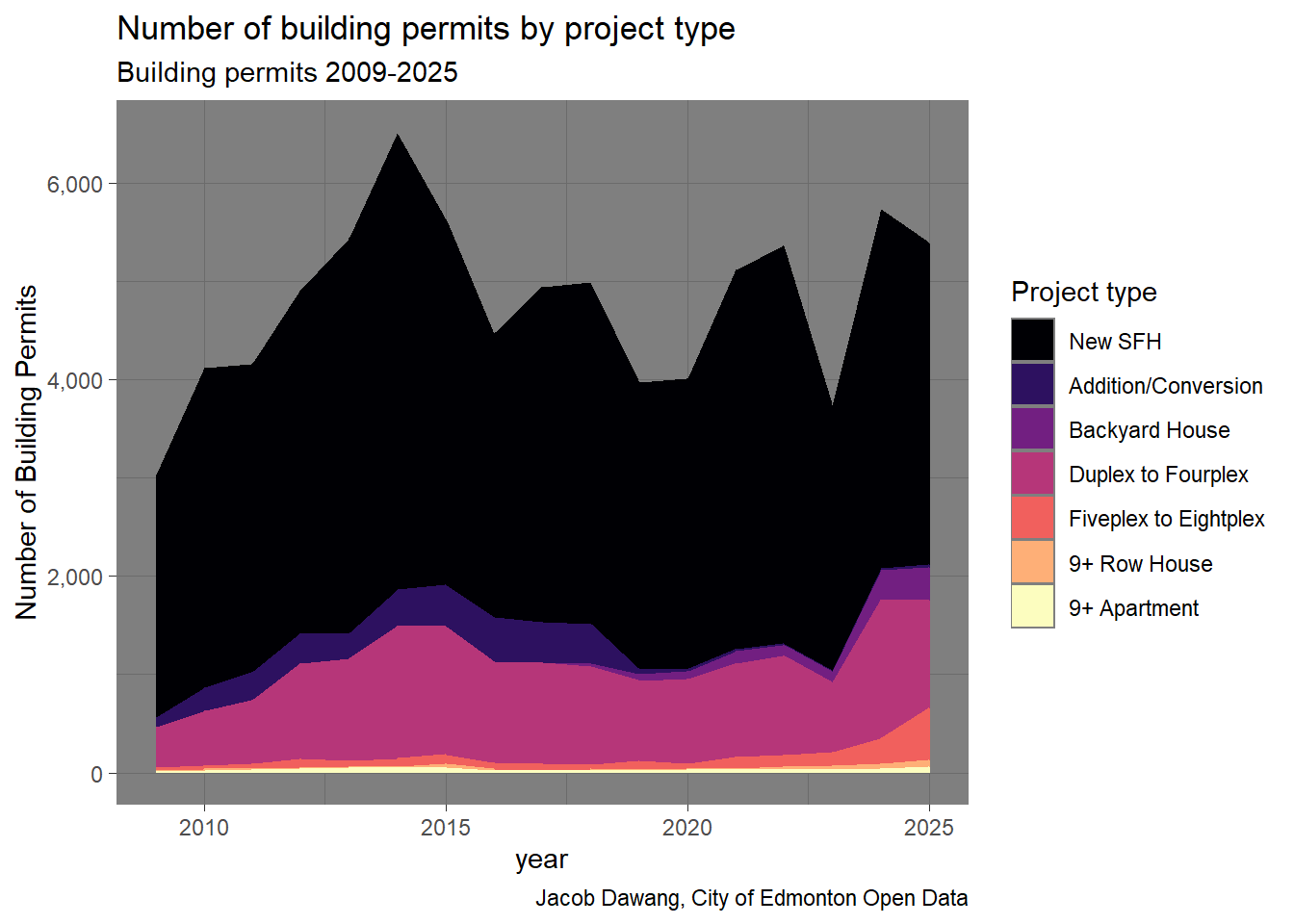 In Figure 4, we can see that 5-8 unit rowhomes and 9+ apartments drove the increase in homes in 2025. While 9+ apartments have historically reached the same scale as in 2025, the rise of 5-8 unit rowhomes is astounding. There is no other explanation except that Edmonton legalized 5-8 unit rowhomes in mature neighbourhoods at the exact right time, when demand was highest.